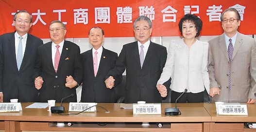 臺(tái)灣六大工商團(tuán)體昨天舉行記者會(huì),呼吁平息“政治紛擾”拼經(jīng)濟(jì)!電電公會(huì)監(jiān)事會(huì)召集人廖伯熙(左一),及五位理事長(zhǎng):工商協(xié)進(jìn)會(huì)駱錦明(左二起)、商總張平沼、工總許勝雄、中小企業(yè)總會(huì)林慧瑛與工業(yè)協(xié)進(jìn)會(huì)許顯榮一字排開(kāi),手牽手呼吁團(tuán)結(jié)。