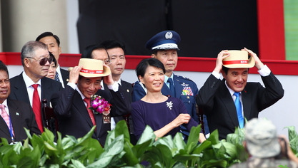 馬英九與王金平在慶典上同戴草帽,氣氛融洽。圖片來自臺灣媒體。