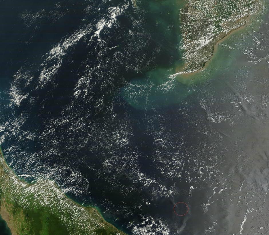 據(jù)美國宇航局發(fā)布的圖片顯示,北京時間3月9日11:35,NASA的衛(wèi)星Terra/MODIS拍攝了相關(guān)海域的一張250米精度的衛(wèi)星圖像,圖片定位約在104.6 E,6.1 N。圖片來源:NASA網(wǎng)站