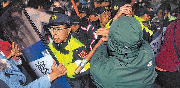 晚上約10時(shí),“行政院”主建筑物大木門被拆下。苦守的警員見大勢已去,表情無奈,但仍試圖阻擋,爆發(fā)一波波推擠,混亂中多名警員和學(xué)生受傷,逾30人送醫(yī)。