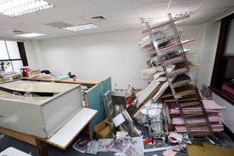 “政委”陳希舜的辦公室,能破的都破了,滿地?zé)熁依,桌椅都被移?dòng)到辦公室外。(圖片來自臺(tái)媒)