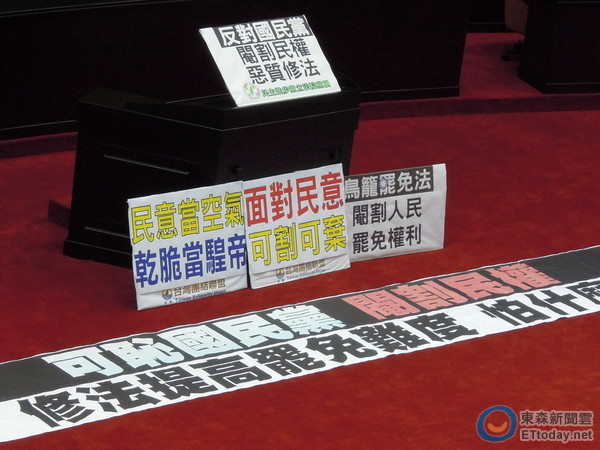 在野黨“立委”持續(xù)占據(jù)主席臺,截至下午1點10分“院會”仍然空轉(zhuǎn)。(圖片來自臺媒)