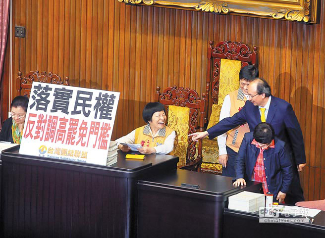 臺聯(lián)黨、民進黨“立委”昨天一早就搶先進入議場,聯(lián)手霸占主席臺,并擺放“鳥籠罷免法,閹割人民罷免權利”、“可恥國民黨,閹割民權,修法提高罷免難度怕什么?”等標語,要求國民黨團應將“監(jiān)督條例復議案”及提高罷免技術門檻的“選罷法”從議程中撤案。