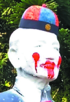 蔣介石銅像被戴上瓜皮帽、臉涂成白色,臉頰有紅色血跡,變成“殭尸”銅像。圖自臺灣《聯(lián)合報》/羅東高中提供