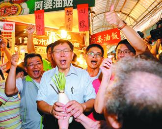 柯隨后到三水市場拜票時,熱情的攤商特地送上“菜頭”,祝他有“好彩頭”。許多民眾看到柯文哲都特別湊上前去,向他比出大拇指喊“加油”?挛恼芤姷侥觊L的民眾,也自然流露醫(yī)師本色,問候身體健康狀況。
