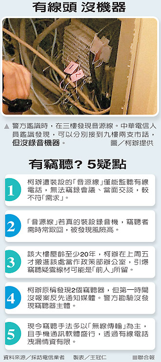 柯辦表示,位于建國(guó)南路上利眾大樓的柯辦政策部辦公室有竊聽器并向警方報(bào)案。轄區(qū)大安分局、市刑大、鑒識(shí)中心先后到場(chǎng)勘查采證,卻沒找到竊聽器,只在3樓找到一條“音源線”。該線若搭配錄音設(shè)備,確實(shí)能聽到九樓柯辦的電話內(nèi)容,卻無(wú)法竊聽到會(huì)議和當(dāng)面交談內(nèi)容。