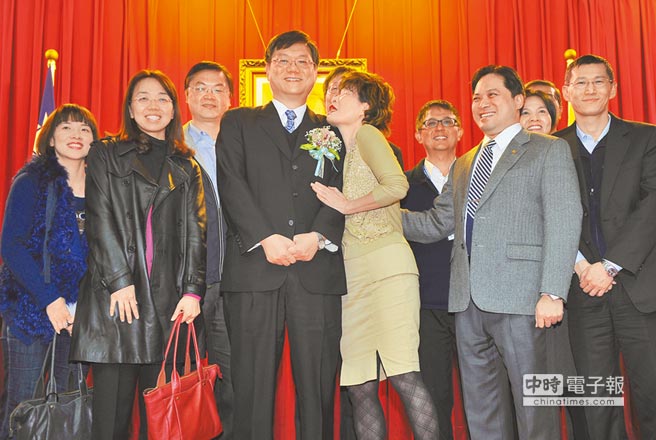 臺“經(jīng)濟部”為即將卸任的“經(jīng)濟部長”杜紫軍(中)舉行歡送會,同仁們輪流與杜紫軍合影,一位女性同仁趁著合影機會企圖要獻吻,不過,由于杜個子高,女同仁怎么親都親不到杜紫軍。(圖片來源:臺灣中時電子報)