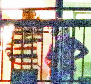 陳水扁(左)5日晚在看護(hù)陪同下,拄著柺杖走出陽臺(tái)看夜景。