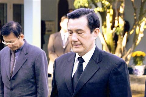 過(guò)去幾年每逢蔣經(jīng)國(guó)逝世紀(jì)念日,馬英九總會(huì)以中國(guó)國(guó)民黨黨主席身份,獻(xiàn)花鞠躬,恭敬站在昔日長(zhǎng)官靈柩與遺像前面報(bào)治理成績(jī)。無(wú)奈去年國(guó)民黨“九合一”地方選舉慘敗,連他自認(rèn)最驕傲的黨主席身份也辭去,上午謁靈可以看到內(nèi)心極大的悲傷與壓力,雙眼緊閉強(qiáng)忍淚水壓抑情緒。