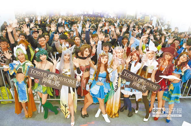2015臺(tái)北國(guó)際電玩展28日起在世貿(mào)一館舉行,人氣手機(jī)游戲《神魔之塔》將展區(qū)規(guī)劃成5區(qū),讓玩家能參與游戲競(jìng)賽、拍攝神魔女將等,粉絲擠爆現(xiàn)場(chǎng)搶拍。(臺(tái)媒圖)