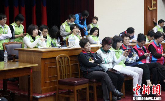 資料圖:2014年3月17日,臺(tái)灣立法機(jī)構(gòu)8個(gè)常設(shè)委員會(huì)聯(lián)席初審海峽兩岸服務(wù)貿(mào)易協(xié)議,從中午起,朝野“立委”在立法機(jī)構(gòu)大禮堂發(fā)生數(shù)波沖突。圖為朝野“立委”搶占主席臺(tái)。中新社發(fā) 陳立宇 攝