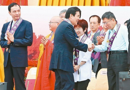 佛光山昨天在馬辦前凱達(dá)格蘭大道慶祝佛誕節(jié),政界要角全到齊。馬英九到場時和臺北市長柯文哲等現(xiàn)場來賓一一致意。記者胡經(jīng)周/攝影 圖片來源:臺灣《聯(lián)合報》