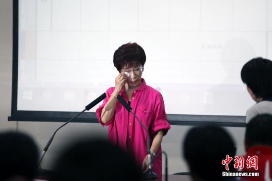 圖為洪秀柱在民調(diào)揭曉后與媒體及支持者見面時(shí),以紙巾擦拭眼角。黃少華 攝