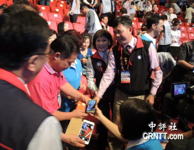 黨代表、中常委等爭(zhēng)相和洪秀柱合照,發(fā)言人徐巧芯一臺(tái)手機(jī)接著一臺(tái)照。(中評(píng)社 黃筱筠攝)