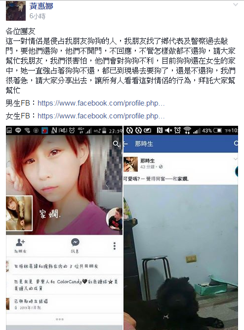 中國(guó)臺(tái)灣網(wǎng)7月28日訊 臺(tái)灣一名網(wǎng)友在臉譜網(wǎng)(facebook)發(fā)文指出,一對(duì)情侶侵占她朋友的狗,“我朋友找了鄉(xiāng)代表及警察過去敲門,要他們還狗,他們不開門,不回應(yīng),不管怎樣做都不還狗”。他們害怕情侶會(huì)對(duì)狗狗不利,請(qǐng)大家分享、幫忙,并附上情侶的臉譜網(wǎng)網(wǎng)址。誰知男生還在網(wǎng)上傳狗狗的照片,并發(fā)文“可愛嗎?”