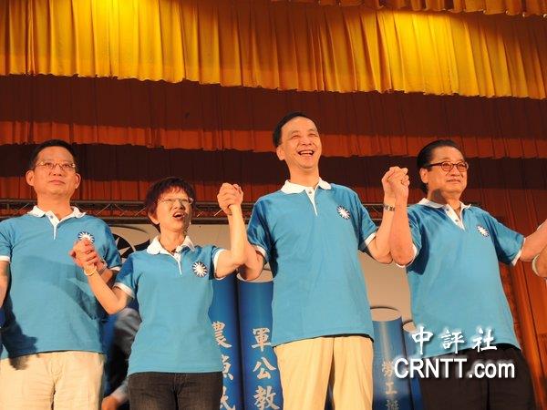 朱立倫在新北挺柱大會上,牽起洪秀柱手喊當(dāng)選
