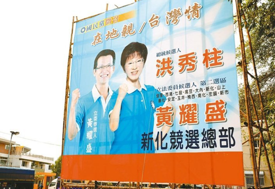 國民黨確定“柱下朱上”,臺南市“立委”參選人黃耀盛已制作多面與洪秀柱合照的大型競選看板,如今面臨“換柱換看板”局面。(臺媒圖)