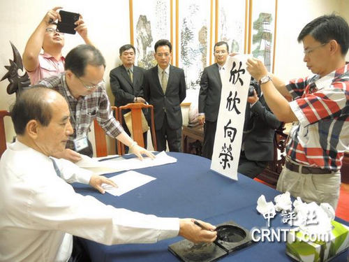9日上午,王金平利用空閑時間揮毫寫下“欣欣向榮”四個字,當做明年春聯(lián)題字。(圖自中評社)
