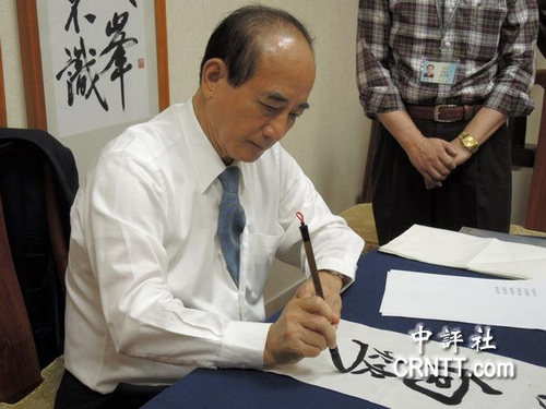 9日上午,王金平利用空閑時間揮毫寫下“欣欣向榮”四個字,當做明年春聯(lián)題字。(圖自中評社)