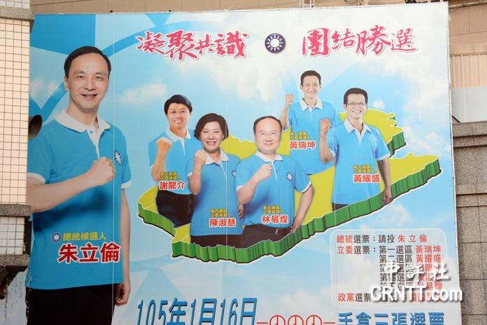 朱立倫與5位臺南市立委參選人的文宣照組合。(中評社 趙家麟攝)