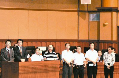 議員呂美玲質(zhì)疑市府利用行政資源介入輔選,要求七區(qū)區(qū)長排排站列席說明,市長林右昌(左2)否認(rèn)傳聞。(圖片取自臺媒)