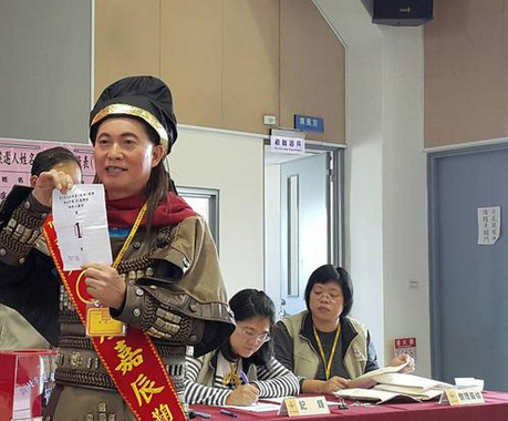 新北市參選第10選區(qū)的國民黨“立委”盧嘉辰,以關公扮相搭車前往選委會。他還帶著“防護犬”,表示要“反賄選”。他手拿關公大刀,一進門卻被“繳械”。盧嘉辰最后順利抽中簽王的1號。