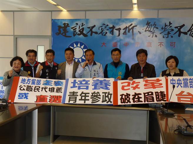 臺(tái)中市國(guó)民黨籍“立委”江啟臣(右三)、顏寬恒(左四)及臺(tái)中市議會(huì)國(guó)民黨團(tuán),今天召開記者會(huì)炮打國(guó)民黨中央,提出三大訴求。圖片來(lái)源:臺(tái)灣“中時(shí)電子報(bào)”