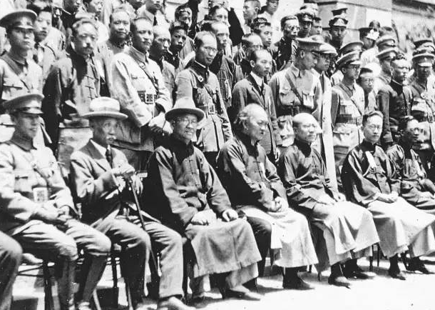 1927年4月18日,國(guó)民政府定都南京典禮。前排自左至右依次為:蔣介石、蕭佛成、鄧澤如、吳稚暉、伍朝樞、胡漢民、王寵惠。