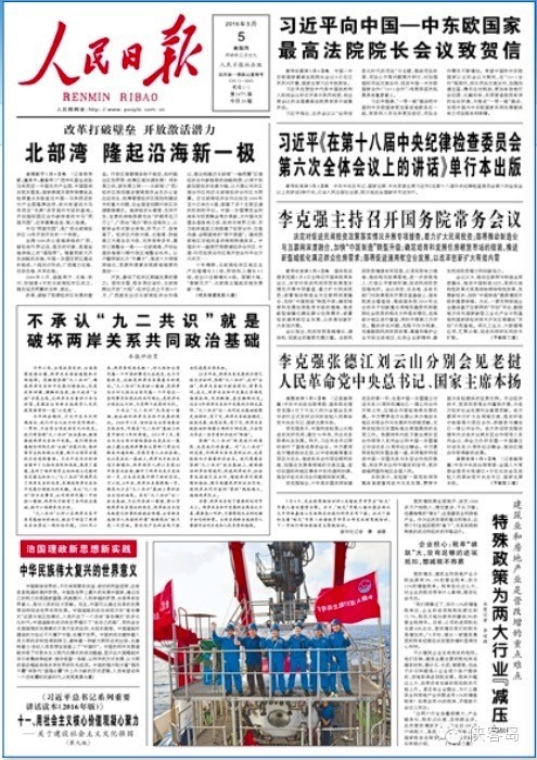 有意思的是,蔡英文勝選后即接受偏藍的《聯(lián)合報》專訪(而非偏綠的《自由時報》之類),專門談到兩岸關(guān)系,要求大陸多釋放一些善意。而心領(lǐng)神會的《聯(lián)合報》立馬摘編出來,放在頭版頭條足量處理,向?qū)Π哆f話的意圖活生生刻在臉上。如今5·20沒幾天了,大陸黨報頭版外加由4日晚的《新聞聯(lián)播》和新華社提前報道,三架馬車式的高規(guī)格大陣仗強力度,自然某種程度上給足了相關(guān)人員面子——正所謂來而不往非禮也。