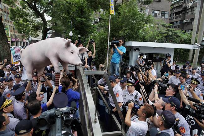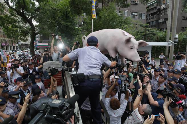 豬農(nóng)激烈抗議高喊“林全下臺(tái)、毒豬入臺(tái)”,抬美豬標(biāo)本翻墻沖進(jìn)“立法院”。(圖片來(lái)源:臺(tái)灣《中時(shí)電子報(bào)》)