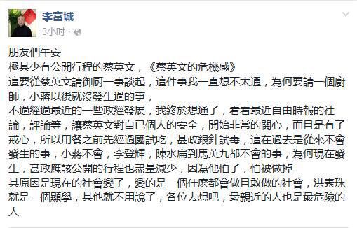 李富城在文中稱,一直想不通蔡英文為何要自費(fèi)請(qǐng)廚子,不過經(jīng)過最近的一些政經(jīng)發(fā)展,才搞清楚了。李富城稱,看看最近的《自由時(shí)報(bào)》的社論、評(píng)論等,蔡英文對(duì)個(gè)人安全開始非常的關(guān)心,而且是有了戒心,所以用餐之前要先經(jīng)過試吃,甚至銀針試毒。李富城稱,這在蔣經(jīng)國(guó)、李登輝、陳水扁以及馬英九時(shí)代都不會(huì)發(fā)生的事情,現(xiàn)在發(fā)生在蔡英文時(shí)代,“因?yàn)樗铝,怕被做掉”,甚至?yīng)該公開的行程也盡量減少了。