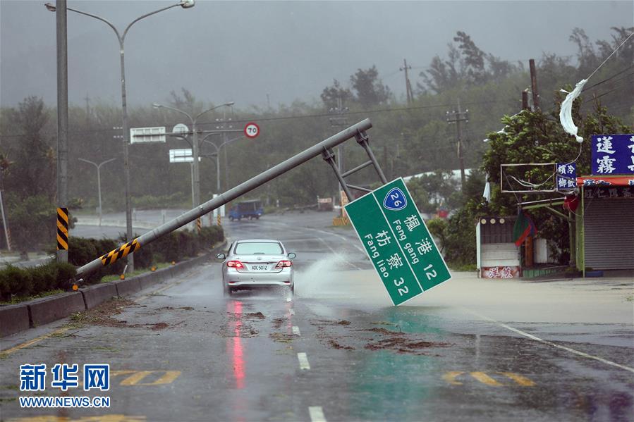 9月14日,在屏東到墾丁的公路上,路牌被大風(fēng)吹倒。當(dāng)日,超強(qiáng)臺(tái)風(fēng)“莫蘭蒂”掠過臺(tái)灣南部地區(qū),最大陣風(fēng)達(dá)16級(jí),造成多地停電,給當(dāng)?shù)鼐用竦纳顜韲?yán)重影響。(新華社 發(fā))