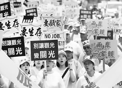 民進(jìn)黨執(zhí)政百天,民怨四起。圖為9月12日,臺(tái)灣觀光業(yè)界冒雨大游行。(資料圖片)