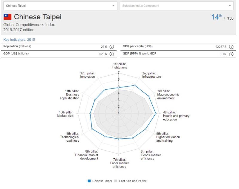 據(jù)臺灣“中央社”28日報(bào)道,在此次的達(dá)沃斯論壇《2016-2017全球競爭力報(bào)告》中,臺灣較去年上升1名,世界排名第14,亞洲排名第4,僅次于新加坡、日本和香港。