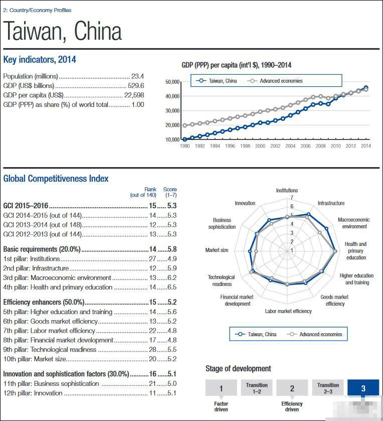 《2015-2016全球競爭力報(bào)告》中,使用的是“中國臺灣”(Taiwan, China)的名稱。