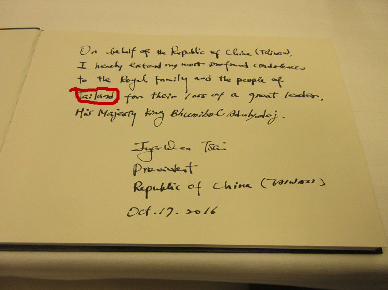 據(jù)臺(tái)灣聯(lián)合新聞網(wǎng)10月17日報(bào)道,泰國國王拉瑪九世普密蓬13日辭世,臺(tái)灣地區(qū)領(lǐng)導(dǎo)人蔡英文今天上午前往臺(tái)北的“泰國經(jīng)貿(mào)辦事處”致哀。蔡英文以英語在簽名簿上留言,但有媒體發(fā)現(xiàn),蔡英文竟然把致哀對象Thailand(泰國)的國名誤寫成“Tailand”,少了一個(gè)“h”,而蔡也因拼錯(cuò)泰國的英文國名,被指“失禮”。