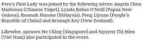 秘魯?shù)谝环蛉搜埜鹘?jīng)濟體領(lǐng)袖女眷出席活動,在照片圖說當(dāng)中,將宋鎮(zhèn)邁錯誤寫為是宋楚瑜的妻子。