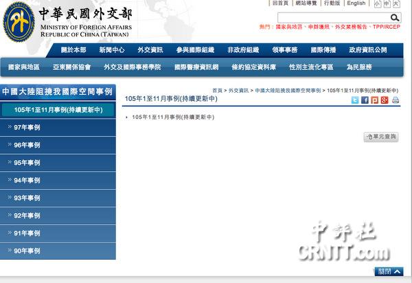 據(jù)悉,陳水扁執(zhí)政時(shí)期,臺(tái)外事部門即在官方網(wǎng)站上刊出“大陸阻撓我國(guó)際空間事例”。而馬英九上任后就再未公開(kāi)過(guò),相關(guān)網(wǎng)頁(yè)也一直空白至今。