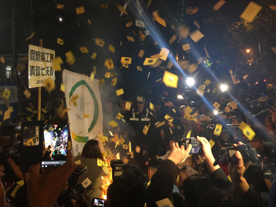 據(jù)報道,場外抗議的勞工團體得知消息后,現(xiàn)場先是彌漫低氣壓,隨即轉(zhuǎn)為憤怒,大喊“民主進步,過橋(指奈何橋)。點亮臺灣,過橋”。抗議群眾氣憤丟執(zhí)煙霧彈,并燃燒蔡英文競選時“點亮臺灣”的旗幟,更揚撒大量冥紙,表示要送民主進步“上路”。勞團高喊“無恥蔡‘政府’,砍假拼經(jīng)濟”,嗆聲“如果民進黨這么愛錢,我們就燒給他們”,隨即高喊“過橋了”。
