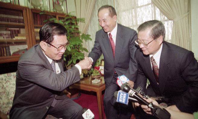 圖為1999年國(guó)民黨下屆“立法院正、副院長(zhǎng)”提名人王金平(中)、饒穎奇(右),拜訪時(shí)任“立法院長(zhǎng)”劉松藩(左)。(臺(tái)灣“中時(shí)”報(bào)系資料圖)