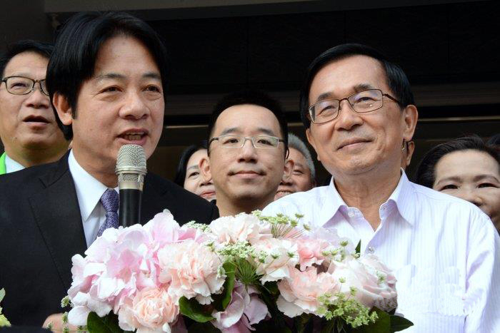 賴清德出席陳水扁女兒陳幸妤的牙醫(yī)診所開幕活動(dòng),并與陳水扁同臺(tái)并致詞。(圖片來源:中評(píng)社)