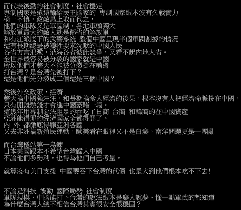 隨后文章從社會制度、外交、經(jīng)濟(jì)等方面列舉了了自己的觀點(diǎn),稱“全世界最容易被分裂的國家就是中國,所以他們才整天把不能被分裂掛在嘴邊,打臺灣?是臺灣先被打下?還是他們先分成兩個或三個中國?”“根本沒有人把經(jīng)濟(jì)命脈投在中國,只有閑錢熱錢才會進(jìn)中國豪賭一場!薄皝喼弈艿米锏慕(jīng)濟(jì)國家全都得罪了”。
