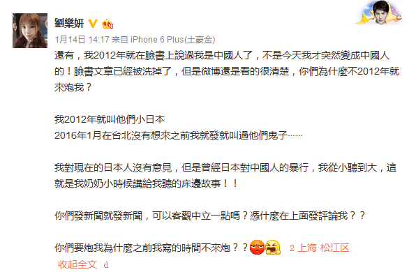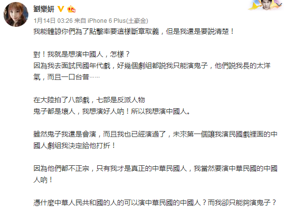 針對劉樂妍再次引發(fā)的輿論爭議,環(huán)球時報-環(huán)球網(wǎng)記者找到其個人微博,發(fā)現(xiàn)其近期微博均和“認同中國人身份”爭議言論有關。劉樂妍1月14日曾發(fā)文稱,“我2012年就在臉書上說過我是中國人了,不是今天我才突然變成中國人的”“我就是想演中國人,怎樣?因為我去面試民國年代戲,好幾個劇組都說我只能演鬼子,他們說我長的太洋氣,而且一口臺普 鬼子都是壞人,我想演好人!所以我想演中國人。”