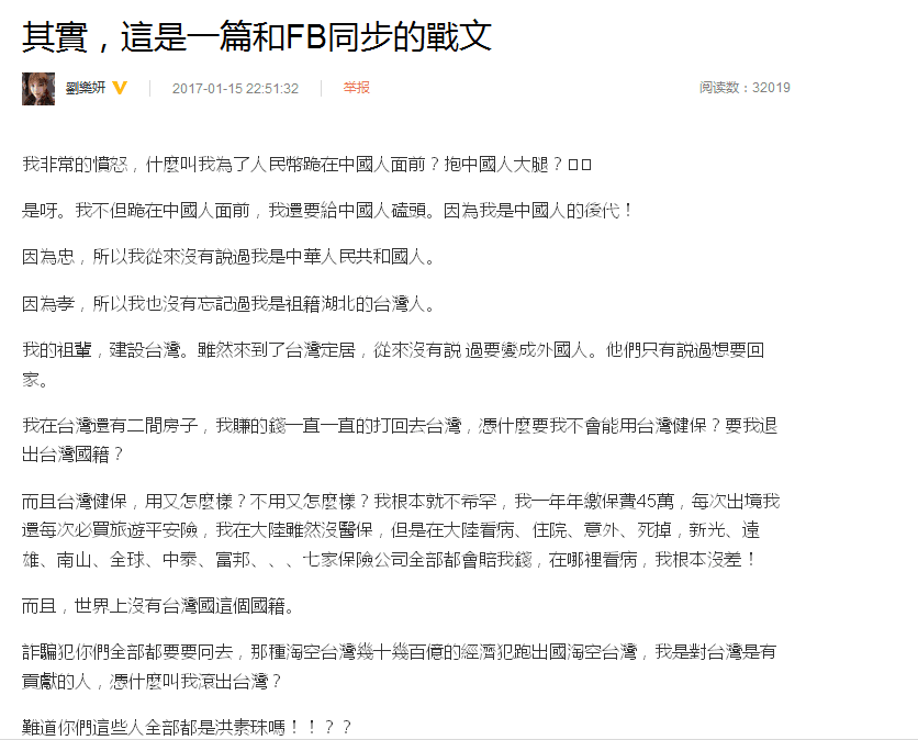 據(jù)臺灣《自由電子報》16日報道,劉樂妍15日在臉譜發(fā)文,反問“什么叫我為了人民幣跪在中國人面前?抱中國人大腿?”她說:“是呀。我不但跪在中國人面前,我還要給中國人磕頭。因為我是中國人的后代!”最后,劉樂妍更直接稱,“世界上沒有臺灣國這個國籍”,并表示自己對臺灣是有貢獻的人,“憑什么叫我滾出臺灣”。