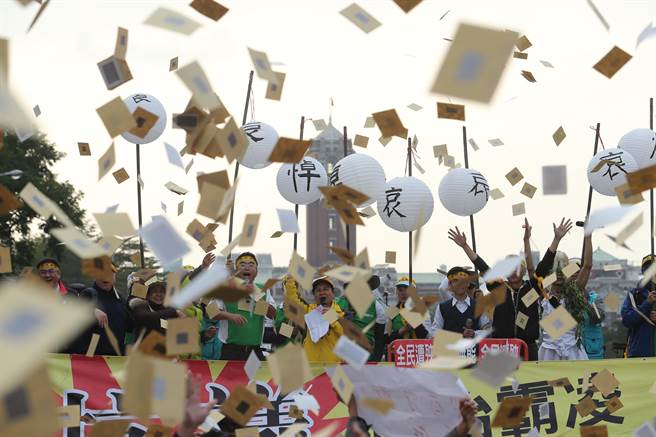 臺(tái)灣“軍公教勞”團(tuán)體舉著白燈籠撒紙錢,為蔡英文當(dāng)局“送終”。(圖片來源:臺(tái)灣《聯(lián)合報(bào)》)