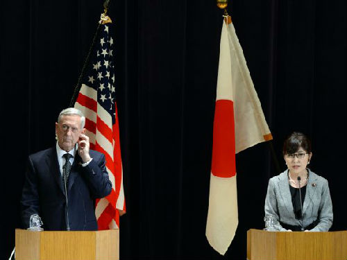2月4日,在日本東京,美國(guó)國(guó)防部長(zhǎng)馬蒂斯(左)與日本防衛(wèi)大臣稻田朋美共同會(huì)見(jiàn)記者。 新華社發(fā)