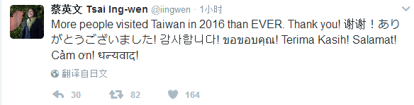 臺灣主計總處日前發(fā)布“國情統(tǒng)計通報”指出,2016年赴臺旅客人數(shù)達1069萬,創(chuàng)歷史新高。蔡英文9日在推特用9種語言,表達感謝;其中,“謝謝”兩字用的是簡體中文。環(huán)球網(wǎng)記者發(fā)現(xiàn),在這9鐘語言中,英語被排在了第一位,而中文排在第二位,并且使用的是簡體字。