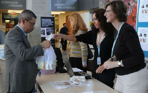資料圖片:2009年5月16日,在瑞士日內(nèi)瓦的世界衛(wèi)生組織總部,一名前來參加世衛(wèi)大會的代表在報名處領(lǐng)取會議贈品——消毒水和消毒紙巾。新華社記者曾毅攝
