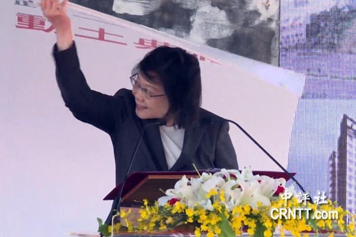 蔡英文2016年12月19日在桃園主持社會(huì)住宅開工典禮,瞬間大風(fēng),把背后廣告牌吹落,軟板砸到蔡英文的頭,被諷“舉頭三尺有神明”。(圖片來源:中評(píng)社)