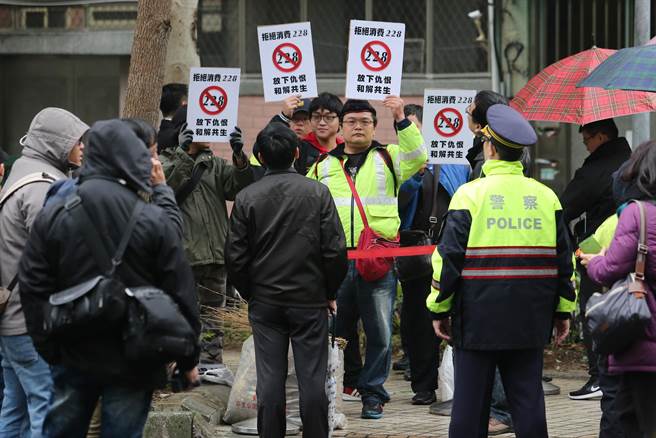 教會門外舉著抗議標(biāo)語的民眾卻在對街高喊,“拒絕消費二二八,放下仇恨、和解共生”。(圖片來源:臺灣“中時電子報”)